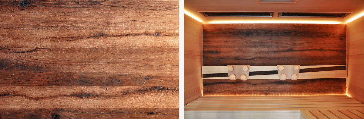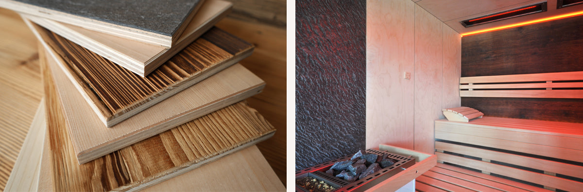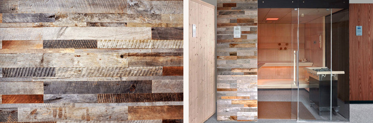Neben den glatten Saunaholzflächen gibt es einzigartige Oberflächen, die sich bestens für den Saunabau eignen und ganz besondere Akzente setzen. Ob mit der eingeprägten Oberfläche alter Holzbalken, aus von Sonne, Wind und Regen veredeltem Altholz oder echtem Schiefergestein – das unterschiedliche Echtholz Plattenmaterial macht Ihre Sauna zu einem ganz individuellen Unikat.