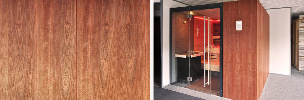 Das amerikanische Kirsch­baum­holz ist ein dunkles, rot­braunes Holz mit einer sehr schönen, aus­ge­präg­­ten Holz­maserung, das Ihre Sauna oder Infra­rot­kabine indivi­duell und stil­voll zur Gel­tung kommen lässt. Das Holz wird von uns als Bretter in geölter Form verlegt.