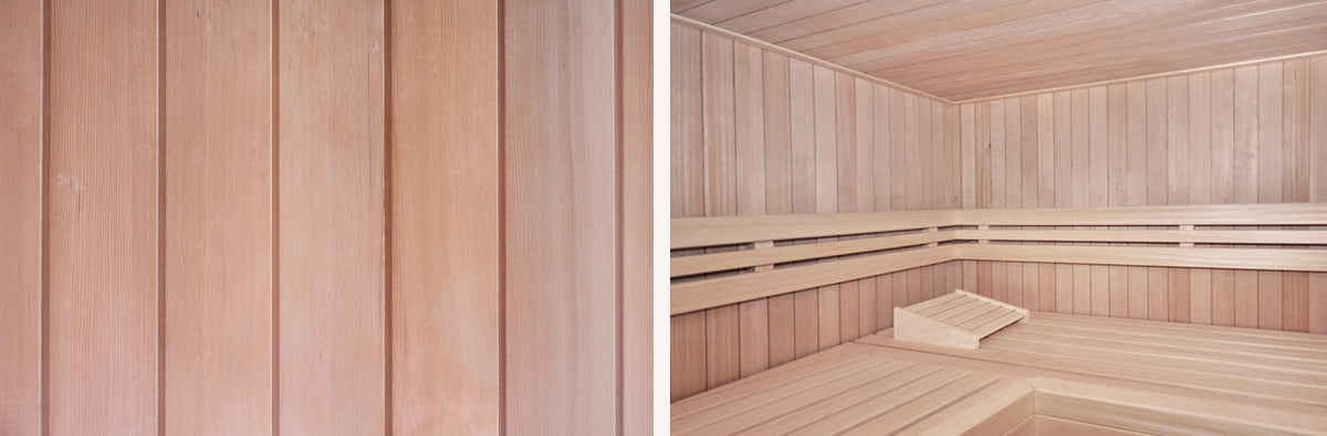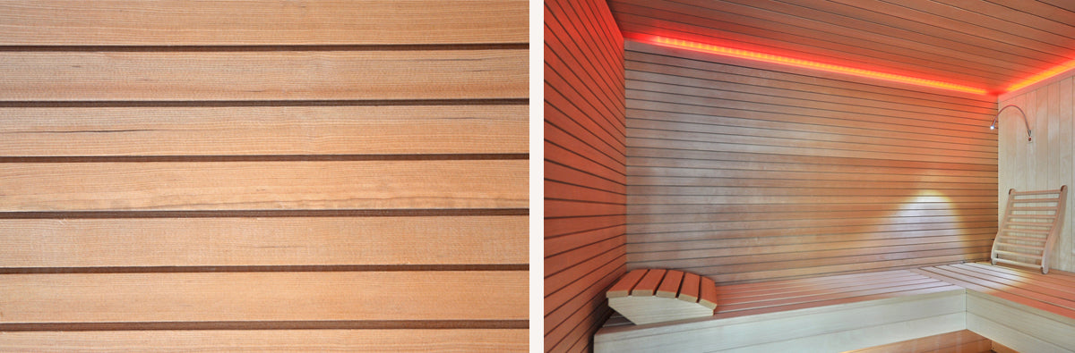 Das Profilholz in Rot­zeder ver­leiht der Sauna, ob als Innen- oder Außen­verklei­dung, ein an­­spre­­chen­­des ab­wechs­lungs­reiches Gesamt­bild. Das Holz sorgt durch sein brei­tes Spek­trum warmer, freund­­licher Farb­nuan­cen, die von hellem Bern­stein­gelb bis zu sattem Rot­braun reichen, für eine harmo­­nische, gemütliche Atmos­phäre in Ihrer Sauna.