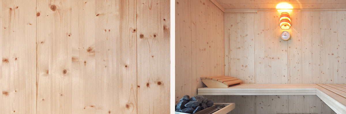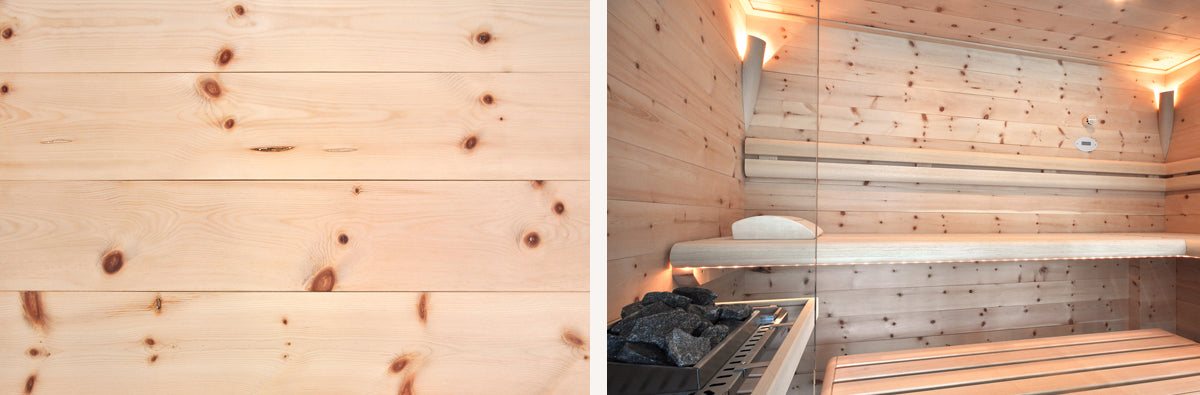 Das Holz der Zirbelkiefer ist relativ weich und lässt sich gut bear­beiten. Das helle Holz wirkt ange­nehm leicht und anspre­chend. Durch seine natür­lichen Astein­schlüsse wird jede Sauna zu einem Unikat.