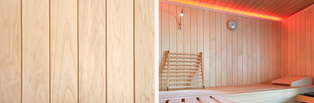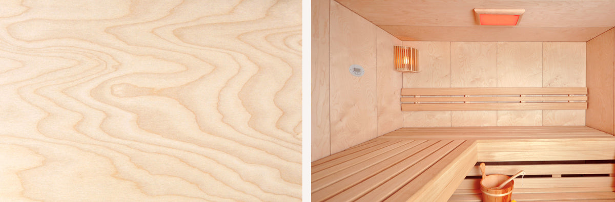 Birkenholz ist ein weiches helles Holz, in einem gleich­mäßig gelb­lich bis hell­braun-rötlichem Farb­ton. Mit einer über­wiegend gleich­mäßigen Fläche gibt es der Sauna eine schlichte, ele­gante Note. Wir ver­arbei­ten das Birken­holz als Sauna­spezial­sperr­holz, hori­zontal oder verti­kal verlegt.