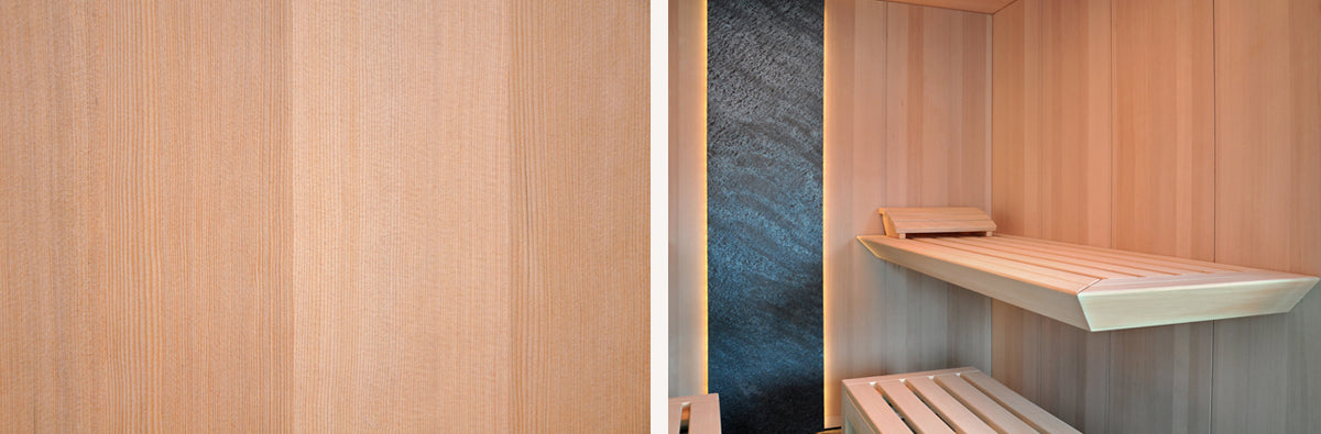 Kanadisches Hemlockholz hat einen gelb­lich-rötlich war­­men Farb­ton. Es ist stabil, lang­lebig und harzt nicht aus. Also ideal für den Sauna­bau. Durch seine über­­wiegend ast­freie Ober­fläche ver­leiht es der Sauna ein moder­nes und klares Er­schei­nungs­bild. Vor allem in Kom­bina­tion mit Glas­fronten, wirkt die Sauna ele­gant und futuris­tisch.
