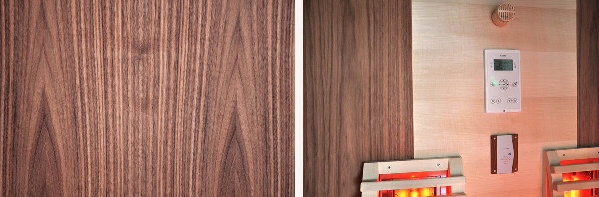 Das Holz des amerika­nischen Nuss­baums, auch Schwarz­nuss, Schwarze Wal­nuss bezeich­net, ist ein röt­lich-grau­braunes Holz aus Nord­amerika. Die unter­schied­lichen Farb­nuancen geben dem Holz seinen unver­wech­sel­baren Cha­rakter. Durch seine ele­gante ästhe­tische Holz­­ma­serung eignet es sich her­vorra­gend als Ver­­klei­dung von Sau­nen oder Infrarotkabinen.