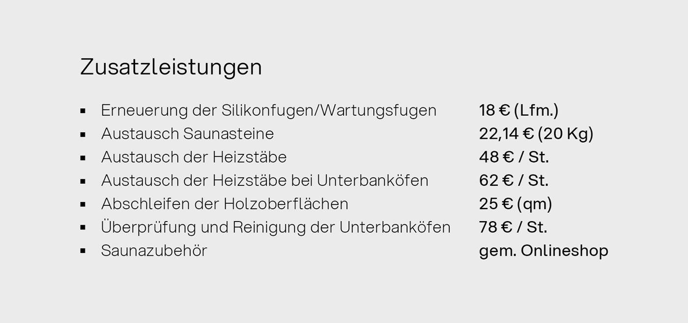 Je nach Beanspruchung und Nutzung Ihrer Sauna sind wir flexibel und können das Wartungsintervall ganz individuell auf Ihre Ansprüche anpassen. Egal, ob Innen- oder Außensauna oder Dampfbad – Sie wählen ein Grundpaket sowie hinzubuchbare Leistungen und das alles ohne eine Vertragslaufzeit. Sprechen Sie uns gerne an, um Ihr individuelles Angebot zusammenzustellen. Stellen Sie Ihr ganz individuelles Wartungspaket zusammen!